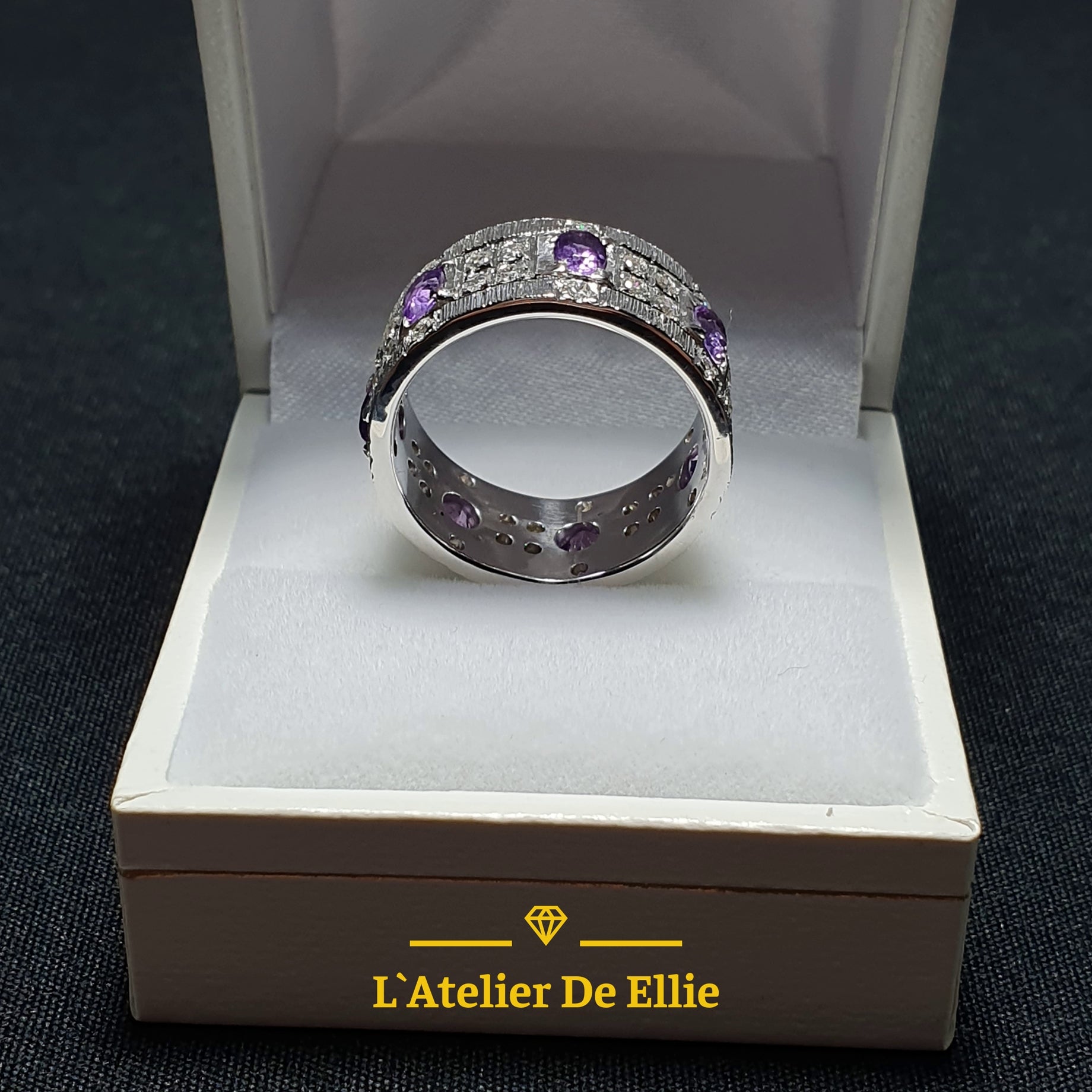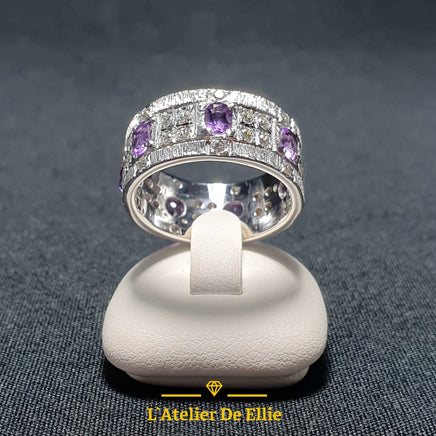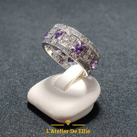 Solid sterling silver ring featuring a natural amethyst stone (4x3mm oval cut) accented with multiple white Swarovski zirconias. The deep violet hue of the amethyst contrasts beautifully with the crystalline sparkle of the zirconia settings, creating a refined and versatile piece. Crafted from hallmarked 925 silver with meticulous attention to detail and engraved by hand, this ring combines gemstone authenticity with contemporary elegance.