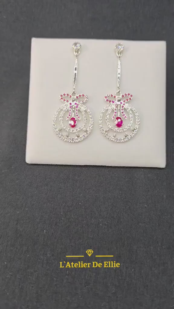 Confectionnées en argent sterling 925, ces boucles d'oreilles cocktail pendantes mettent en valeur des rubis synthétiques rouge profond associés à des oxydes de zirconium brillants, pour une élégance raffinée. Leur design en cascade crée un jeu de lumière dynamique, tandis que la base en métal précieux garantit une qualité durable. Parfaites pour les occasions spéciales et les soirées, ces boucles d'oreilles incarnent une sophistication intemporelle avec une touche vintage. Un choix distingué pour celles et ceux qui apprécient le savoir-faire joaillier et l'authenticité du design.