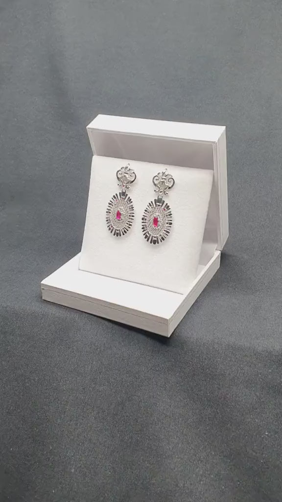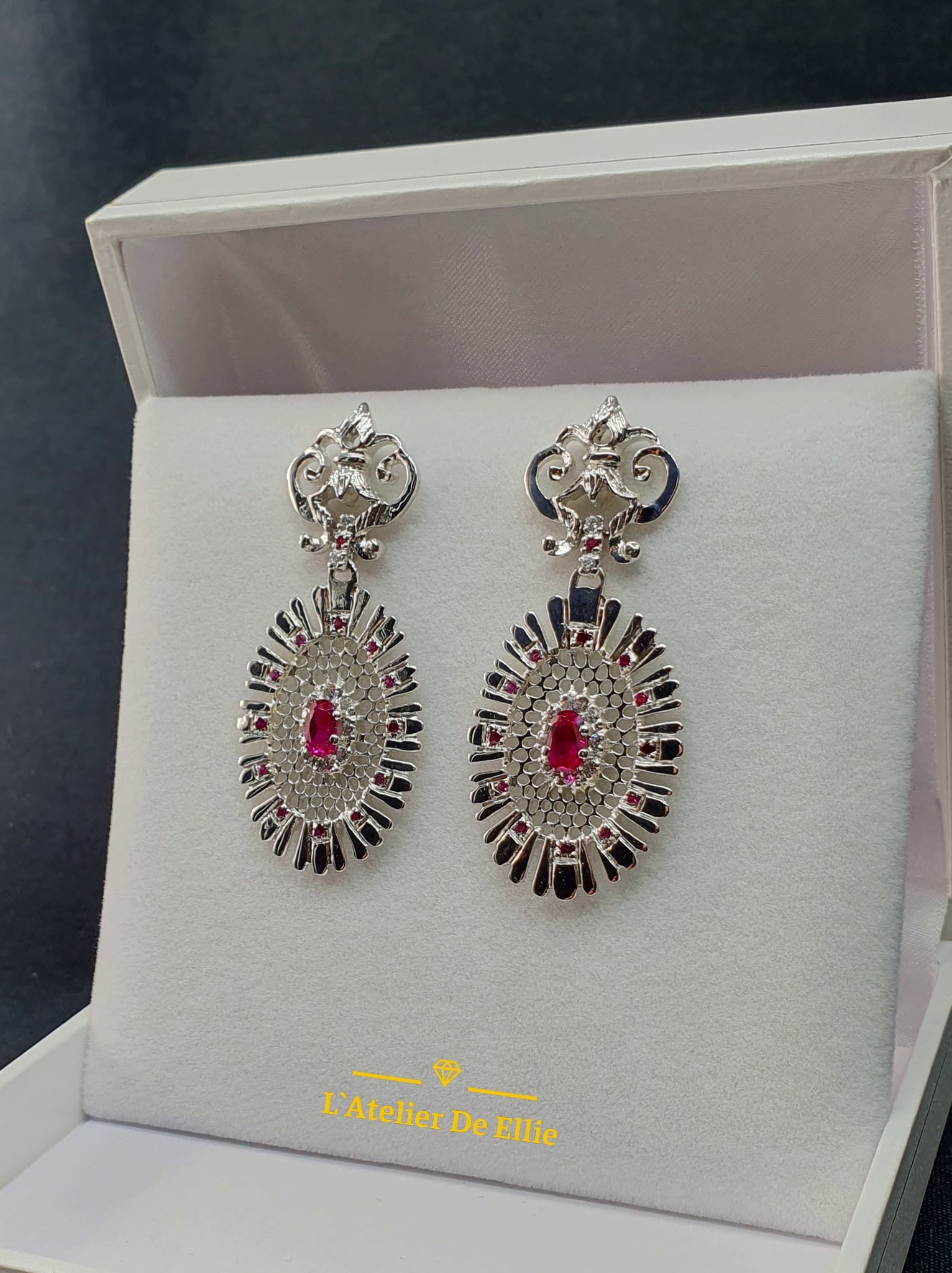 Magnifiques boucles d'oreilles cocktail pour femme en argent 925, ornées de rubis synthétiques et de zirconiums blancs. Leur surface richement texturée est obtenue grâce à un travail artisanal minutieux. Les tons rouge profond des rubis apportent une chaleur visuelle contrastant avec l'éclat cristallin des zirconiums, créant ainsi une composition harmonieuse. Chaque boucle d'oreille est gravée à la main avec une grande précision et un souci du détail exceptionnel.