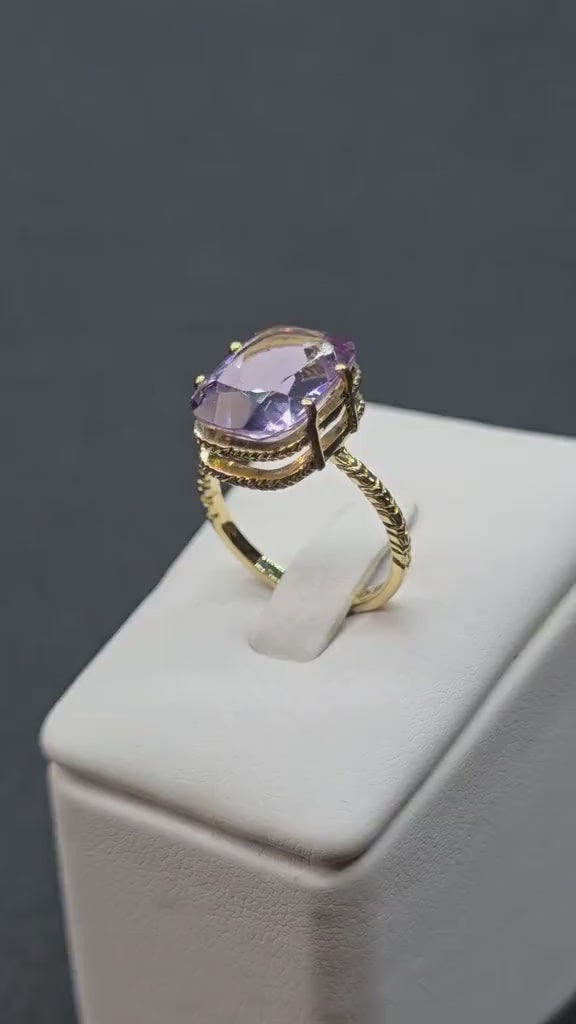 Discover the captivating allure of this handcrafted 18k yellow gold ring, featuring a stunning 6.94-carat natural amethyst from Brazil. The stone's mesmerizing bluish-violet hue is showcased through meticulous hand engraving and an expertly designed setting that allows light to penetrate from every angle, amplifying the gem's brilliance and depth. Each facet has been carefully considered to enhance the amethyst's natural beauty while ensuring optimal luminosity. This substantial piece combines traditional craftsmanship with thoughtful design, creating a timeless statement ring for those who appreciate fine gemstone jewelry and artisanal excellence!