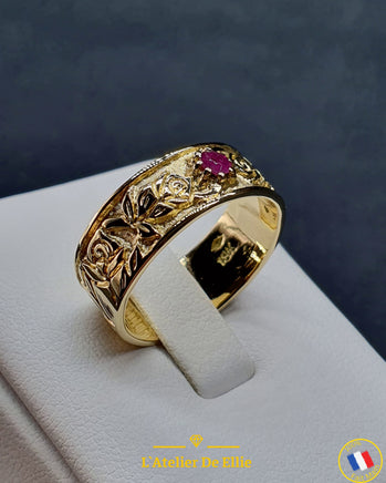 This exquisite ring from L'Atelier De Ellie showcases masterful craftsmanship in solid 18k yellow gold. Hand-engraved rose motifs flow across the band, complemented by a striking natural ruby stone that radiates timeless elegance. An original atelier design, the piece is meticulously handcrafted with precision and care. This heirloom-quality creation merges traditional goldsmith techniques with refined minimalist aesthetics—a sophisticated statement for those who appreciate authentic artisanal jewelry!